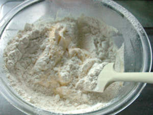 ![]() ④粉類を加え、ゴムべらに持ち替えて、さっくりと練らないように、少し粉っぽさが残る程度に混ぜましょう。 |