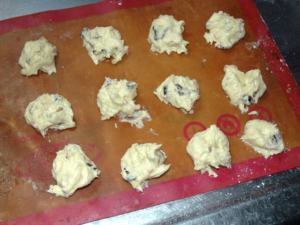 ![]() ⑦オーブンシートに、スプーンですくった生地を乗せます。 (生地が大体2cmくらいの大きさになるようにする。) |