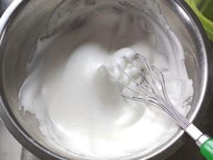 ![]() ①卵黄と卵白を別々のボールに入れます。 ②卵白に砂糖を一つまみ加えて泡立て始め、途中二回に分けて砂糖を加え、ピンと角が立つまで泡だててメレンゲを作りましょう。 |