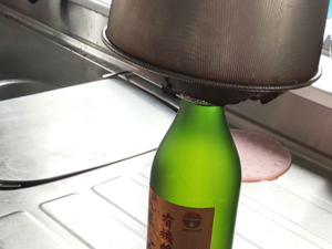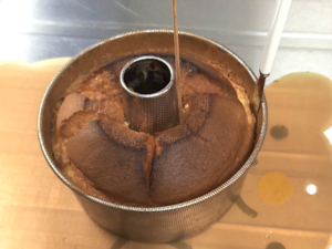![]() ⑪ケーキが焼けたら、すぐに逆さにして、瓶などに挿し、このまま2時間以上放置しましょう。 |