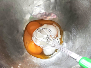 ![]() ③卵黄のボールに砂糖を加えて泡立て、白っぽくとろりとするまで泡だてましょう。 |