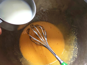 ![]() ④牛乳を少しずつ加え、その都度良く混ぜます。 |