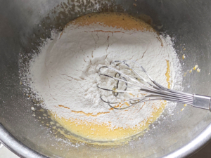 ![]() ⑥上新粉とベーキングパウダーを合わせてふるい入れ、粉っぽさが消えるまで良く混ぜ合わせましょう。 |