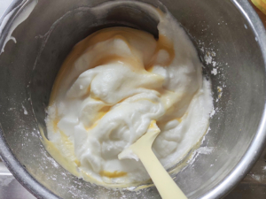 ![]() ⑦卵黄のボールにメレンゲを加え、ゴムべらに持ち替えて、さっくりと練らないように混ぜます。 |