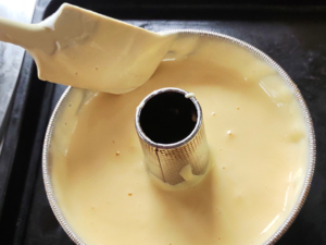 ![]() ⑧型に生地を流しいれ、筒部分を押さえて、二回ほどトントン落として空気を抜きます。 ⑨箸をケーキ内で、くるくる回しながら一周させ、中の気泡も取り除きましょう。 |