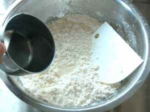 ![]() ②冷水を加え、スケッパーを使って、練らないように混ぜ、粉が見えなくなったら、ひとまとまりにしましょう。 |