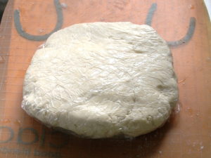 ![]() ③生地が軽くひとまとまりになったら、ラップで包み、冷蔵庫で1時間冷やします。 (後で伸ばすので、綺麗にまとまっていなくても大丈夫です。) |