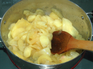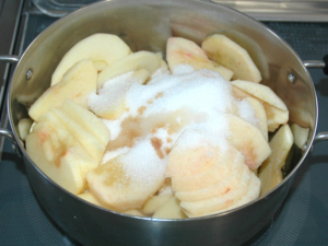 ![]() ④生地を冷やしている間に、りんごの処理をします。 ⑤リンゴは皮と芯を除き、薄切りにしましょう。 ⑥鍋にりんごとグラニュー糖、レモン汁、バニラオイルを入れて火にかけます。 |