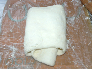 ![]() ⑧生地が冷えたら、打ち粉(強力粉で)をしながら、長方形に伸ばし、伸びたら、三つ折りにします。 |