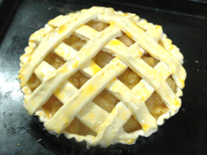 ![]() ⑭底の生地の上に、冷やしたリンゴを敷き詰め、上からシナモンシュガーを振ります。 ⑮帯状の生地を交互に重ねて、格子状にしたら、卵黄と牛乳を混ぜたものを刷毛で塗ります。 |
