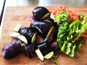 ⑤フライパンに茄子、人参、ピーマンを入れて炒め、ナスがくたっとしたら、肉と白菜の芯部分を入れて炒めます。