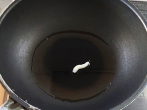 ④フライパンに多めに油(分量外)を引き、にんにくを入れて炒め、香りを出します。
