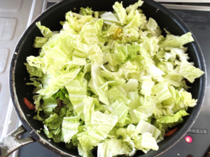 ⑧残りの白菜をすべてフライパンに加え、白菜がしなっとするまで炒めます。
