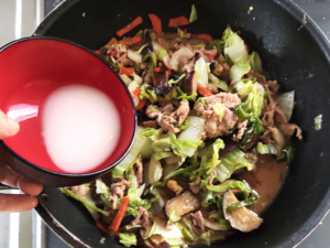 ⑨具材に火が通ったら、一旦火を止め、水で溶いた片栗粉を回しかけましょう。