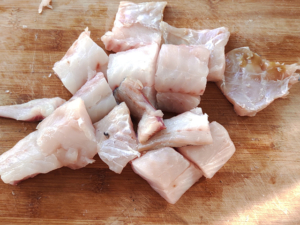 ![]() ①たらは大きめの一口サイズに切ります。 |