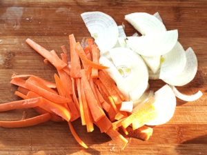 ![]() ③人参は皮をむき細切りに、玉ねぎは皮をむいて薄切りにします。 |