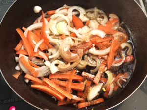 ![]() ⑤フライパンに人参と玉ねぎ、水100cc(分量外)を入れて火にかけ、ふたをして2~3分ゆでます。 ⑥人参がしなっとしたら、酒、砂糖、寿司酢、ケチャップ、醤油、みりんも加え、全体を混ぜます。 |