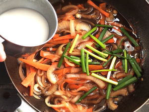 ![]() ⑧野菜にしっかりと火が通ったら、一旦火を止めてねぎを加え、片栗粉を水で溶いたものも加えて混ぜます。 ⑨再び火にかけ、とろみがついたらOK。 |