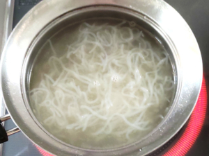 ![]() ①白滝は食べやすいように、長さを三等分します。 |