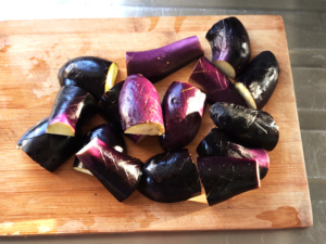 茄子に切れ目を入れておくと、早く火が通ります。