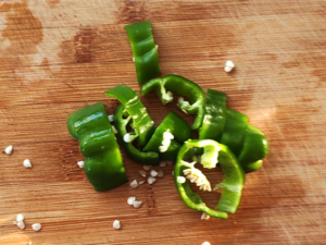 ![]() ②ピーマンは種とヘタを取り、適当な幅に切りましょう。 |
