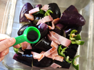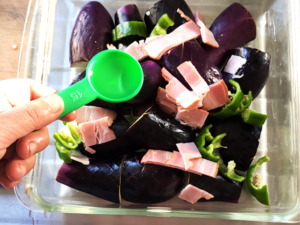 ![]() ④耐熱容器(今回はイワキのケーキ型・20cm角を使いました)になす、ピーマン、ベーコンを並べ、全体に油を回しかけます。 |