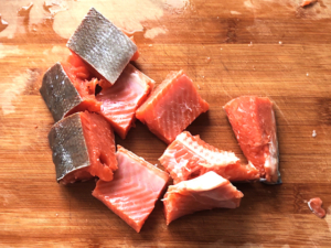 ![]() ②塩鮭もちょっと大きめの一口大に切ります。 (できれば、ここで骨を取っておいてください。) |