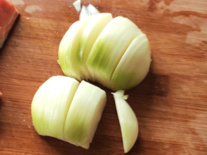 ![]() ③玉ねぎは皮をむき、薄切りにしましょう。 |