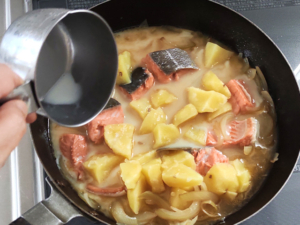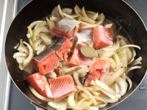 ![]() ⑥玉ねぎに火が通ったら、鮭、水、マギーブイヨンを加えて沸騰させます。 |