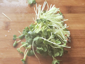 ![]() ②カイワレ大根は根元を落とし、長さを3等分にします。 |