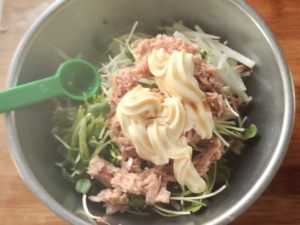 ![]() ③ボールに、大根、カイワレ、ツナ、マヨネーズ、麺つゆを入れてよく混ぜ合わせましょう。 (食べる直前に和えてください。) |
