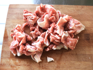 ![]() ①豚こま肉は、食べやすい長さに切ります。 |