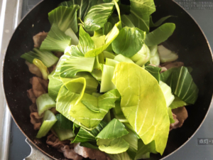![]() ⑤フライパンを綺麗にしてから、再度油(分量外)を薄めに引き、肉の色が白くなるまで炒めます。 ⑥肉の色が変わったら、チンゲンサイも加え、さっと強火で1分ほど炒めましょう。 |