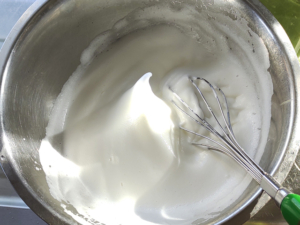 ![]() ①卵白のボールに砂糖をひとつまみ加えて泡立て始め、クリーム状の硬さになったら、二回に分けて砂糖を加え、ピンと角が立つまで泡立てます。 |