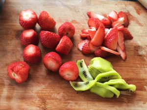![]() ⑫苺はヘタを落とし、反対側の根元も軽くカットし、断面が平らになったものを10個ほど作り、飾り用の苺は縦半分にスライスします。 ⑬キウイも苺と同じようにスライスしましょう。 |