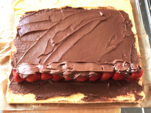 ![]() ⑭端を斜めに切り落としてから、クリームを塗り広げます。 ⑮手前に切った苺を並べ、苺の上にもクリームを乗せましょう。 |