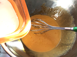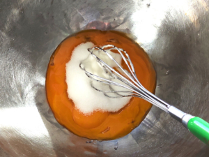 ![]() ③牛乳と油の混合液をレンジで20秒ほど加熱し、人肌になったら、卵黄のボールに少しずつ加え、その都度良く混ぜます。 |