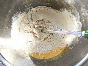![]() ④卵黄のボールに薄力粉をふるい入れ、粉っぽさがなくなるまで混ぜましょう。 |