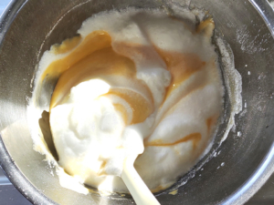 ![]() ⑤卵黄のボールの中身を全て卵白のボールに移し、ゴムべらに持ち替えて、さっくりと練らないように混ぜましょう。 |
