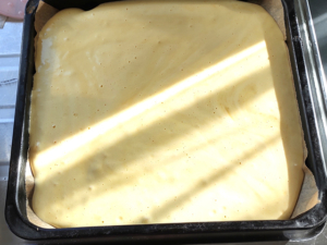 ![]() ⑥天板に薄く油を塗って、オーブンシートを敷いたら、生地を流し入れ、平らにならします。 ⑦上からトントン落として大きな気泡を取り除きましょう。 |