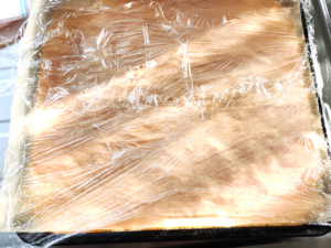 ![]() ⑧ケーキが焼けたら、すぐに上にオーブンシートを乗せ、さらにラップに包んで、しっかりと冷ましましょう。 |