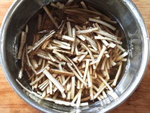ゴボウは酢水につけると、灰汁が抜けます。