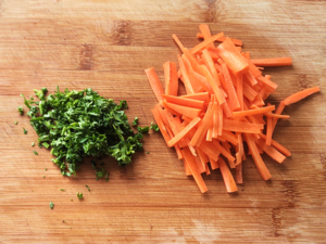 ②人参は皮をむいて細切りに、パセリはみじん切りにしましょう。