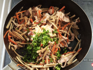 ④フライパンに薄く油(分量外)を引き、人参とごぼうを3分ほど炒めて、しんなりすればOK。