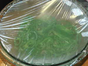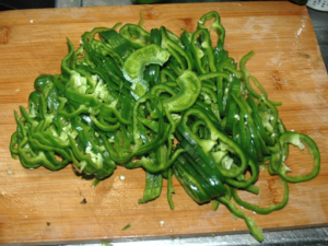 ![]() ①ピーマンは種とヘタを取り、薄い輪切りにします。 |