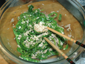 ![]() ④ピーマンが柔らかくなったら、白ごまと天かすを入れてさっと混ぜます。 |