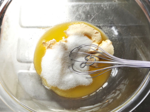 ![]() ①耐熱ボールにマーガリンを入れ、レンジで20秒加熱して柔らかくします。 ②砂糖を加え、ざらざら感がなくなり、白っぽくなるまでしっかりと混ぜましょう。 |