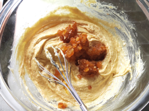 ![]() ⑥オレンジピールを加え、バラバラになるように泡立て器で先に崩してから、全体を混ぜ合わせます。 |