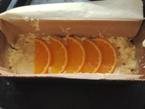 ![]() ⑧パウンド型にオーブンシートを敷き、生地を入れて平らにならします。 ⑨平らになったら、オレンジの半月切りを5枚ほど上に乗せましょう。 |