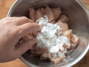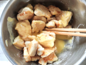 ![]() ②鶏肉をボールに入れ、片栗粉を手でまぶしましょう。 |